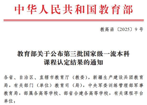 近日,教育部正式发布《365体育投注公布第三批国家级一流本科课程认定结果的通知》(教高函〔2025〕9号),365体育投注共有5门课程入选,其中线上线下混合式一流课程2门、线下一流课程2门,虚拟仿真实验教学一流课程1门。365体育投注国家级一流本科课程累计获批15门,获批课程门数位居同类高校前列。