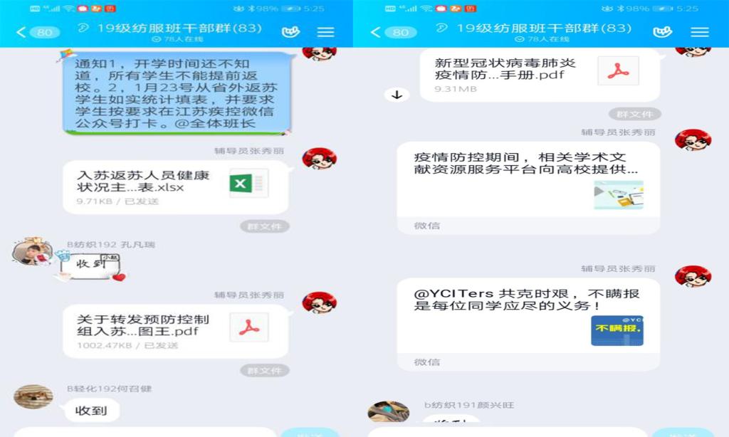 疫情防控期间,她按照学校、学院要求,认真及时做好疫情统计上报、宣传教育和个别学生的心理疏导等工作。在与责任班级每位同学通电话后,她全面、准确地了解了学生在家学习、生活情况,并有针对性的开展专题教育。她尤其注重学生的心理疏导和咨询,B纺织192班一位同学的姐姐除夕从武汉返回,全家居家隔离,她了解情况后及时与其联系,并叮嘱他注意合理作息,加强自主学习。纺织192班一名同学回湖北老家过寒假,她与该生母亲通电话,叮嘱他们全家注意身体健康,做好科学防护。学生平安健康是她最大的期盼。