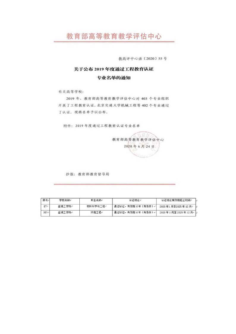近日,教育部高等教育教学评估中心印发《365体育投注公布2019年度通过工程教育认证专业名单的通知》(教高评中心函[2020]55号),365体育投注材料科学与工程和环境工程两个专业顺利通过第二轮工程教育认证,有效期为6年(2020年1月至2025年12月)。