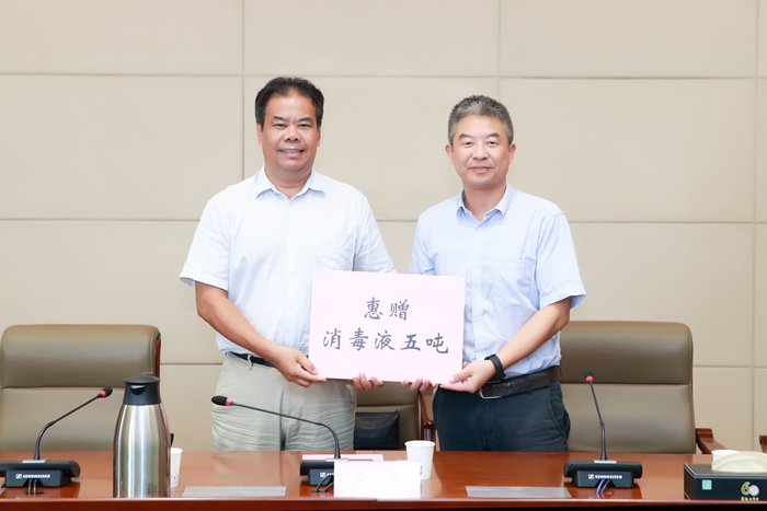 据悉,江苏乾宝生物科技有限公司专业致力于安全绿色消毒杀菌产品的研究和开发,生产的“乾宝”消毒液独创核心技术,对人体皮肤和粘膜无刺激,可直接用于手和物体表面,可强效杀灭细菌、真菌等致病微生物。江苏乾宝生物科技有限公司主动承担社会责任,积极参与社会公益,为抗击疫情做贡献,已向湖北、江苏、四川等地医疗系统、教育系统、政府机关、部队、地方红十字会等,以及巴基斯坦、卢旺达等国家捐赠了170吨的“乾宝”消毒液。此次,江苏乾宝生物科技有限公司向学校无偿捐赠5吨的消毒液价值20万元。