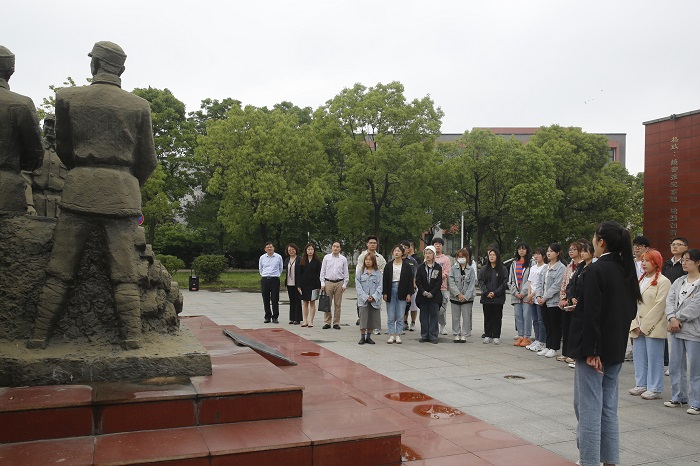 指导组还观看设计艺术学院学院2021届毕业生设计作品展览和教工党员结合党史学习教育开展课程思政实践的成果展示,观摩了“梦之声”合唱团训练,聆听师生在校园红色阵地铁军广场讲述新四军的故事。