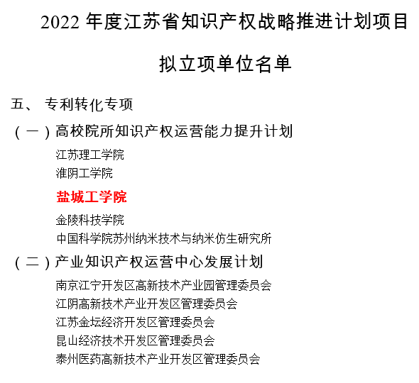 学校先后获批省知识产权培训(盐城)基地、省知识产权信息服务公共网点、省知识产权智库联盟单位、省高校知识产权先进集体等,荣获盐城市专利金奖1件,银奖6件。新增授权发明专利 1212件,发明专利授权数连续5年进入全国高校百强行列;专利转化612件,专利转让总数列“最新中国高校专利转让榜单(TOP100)”第22位。