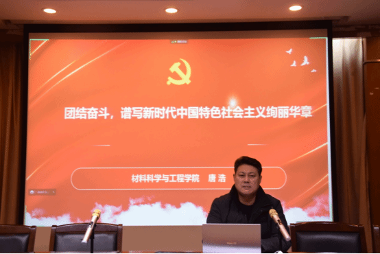 12月8日晚,在北校区化工楼重点实验室报告厅,校党委宣讲团成员、材料学院党委书记唐浩作题为《团结奋斗,谱写新时代中国特色社会主义绚丽华章》的党的二十大精神宣讲报告。报告采取线上和线下结合的方式,学生党员、班级团支书、学生会主要干部、积极分子等300余人参加。