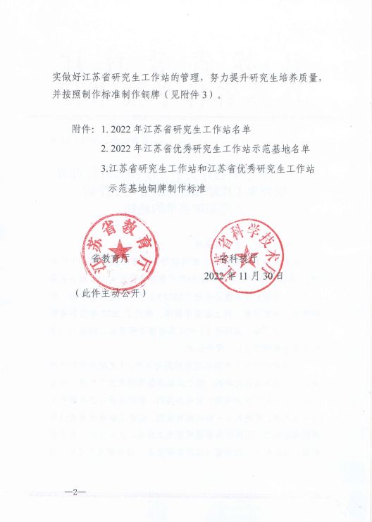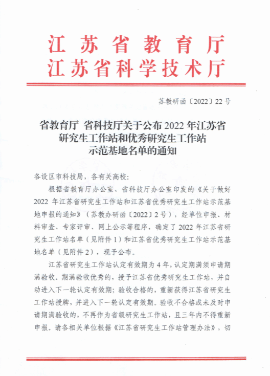 近日,江苏省教育厅、科技厅公布了2022年江苏省研究生工作站名单,365体育投注获批14个省级研究生工作站,获批数量列全省同类高校首位。至此,365体育投注已建有江苏金风科技有限公司、江苏中车电机有限公司、盐城市建筑设计研究院有限公司等61个省级研究生工作站。