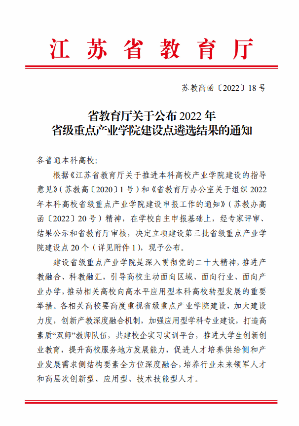 近日,江苏省教育厅下发了《省教育厅365体育投注公布2022年省级重点产业学院建设点遴选结果的通知》(苏教高函〔2022〕18号),365体育投注悦达新能源汽车学院获批省级立项。这是继365体育投注新能源学院获得省级重点产业学院后,又一产业学院获此殊荣。