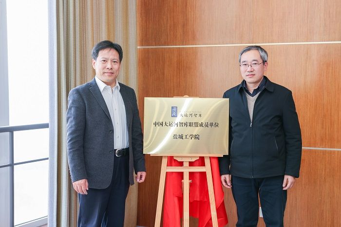 重庆智库总裁、中国大运河智库联盟理事长王佳宁与盐城工学院党委常委、宣传部部长奚新国共同揭牌