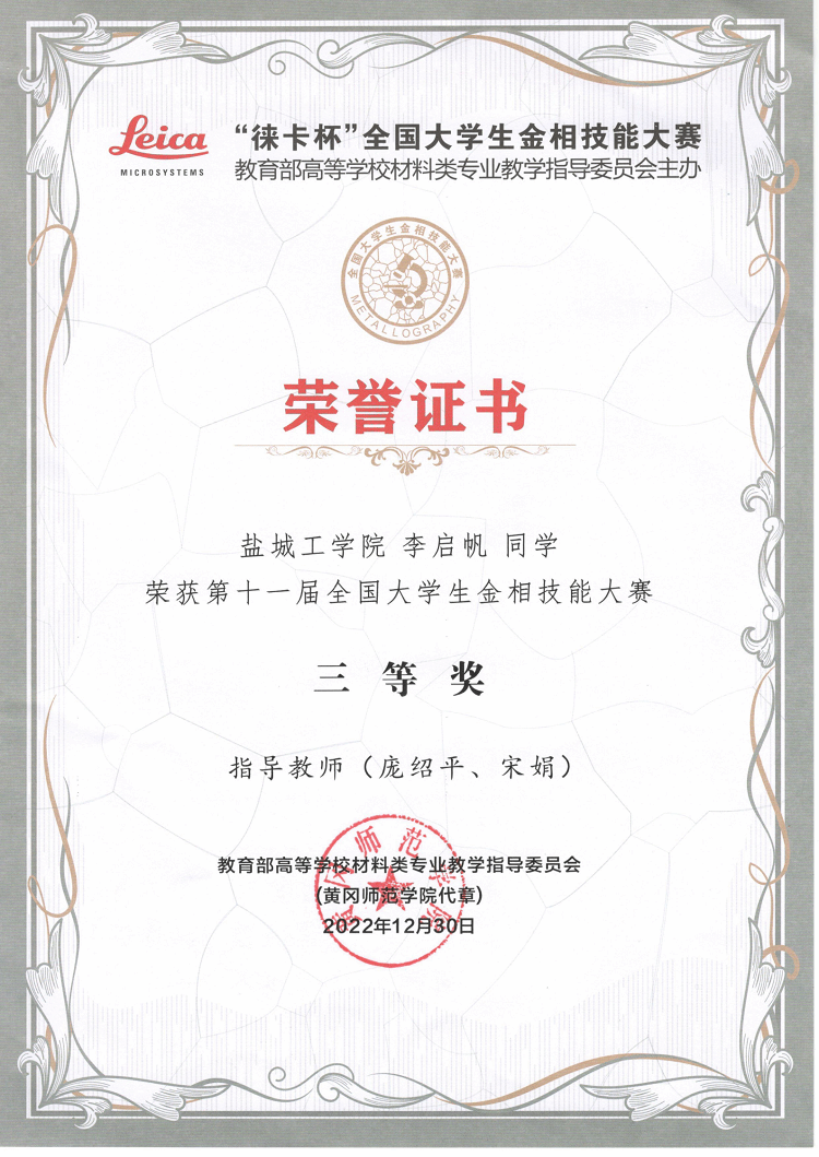 近日,第十一届全国大学生金相技能大赛结果公布,365体育投注参赛队伍由材料学院孙瑜、庞绍平、宋娟三位老师指导,分别获得一等奖1项(学生:杨馨悦),二等奖2项(学生:李家顺、罗楷),三等奖1项(学生:李启帆)。至此,365体育投注学生连续八年获得该赛事一等奖。