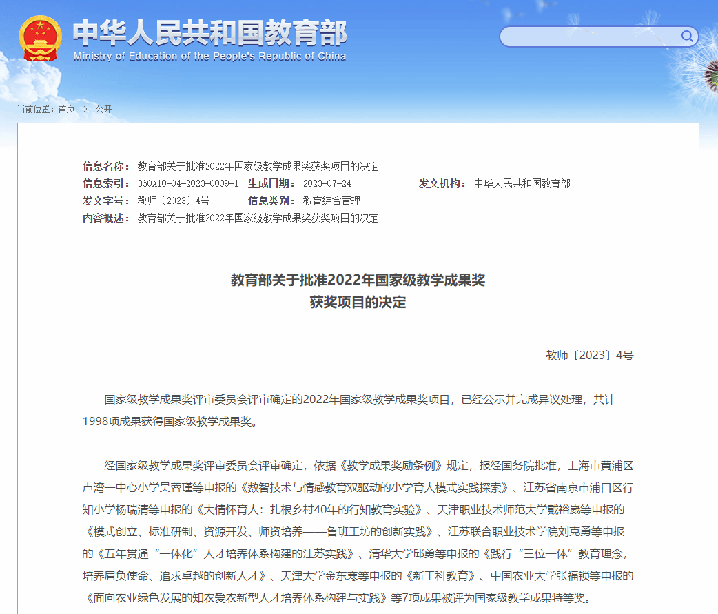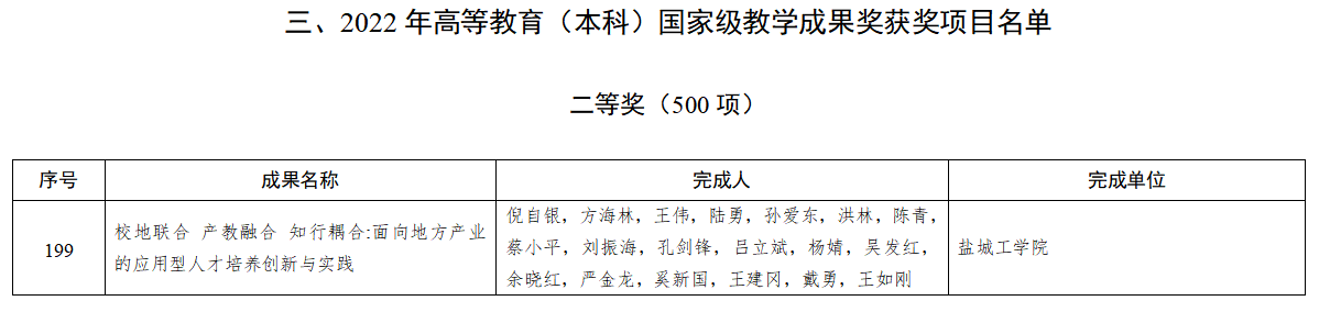 近日,教育部公布了2022年国家级教学成果奖获奖名单,共计572个项目入选高等教育(本科)国家级教学成果奖获奖项目名单,盐城工学院以第一完成单位获得二等奖1项。