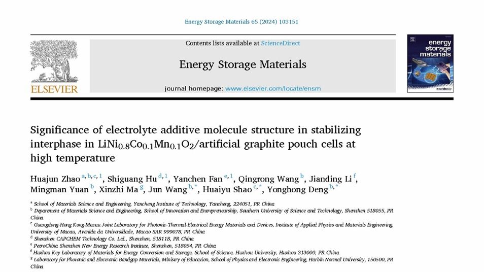 近日,365体育投注材料学院赵华军博士在国际材料学科顶级期刊《Energy Storage Materials》上发表题为《Significance of Electrolyte Additive Molecule Structure in Stabilizing Interphase in LiNi0.8Co0.1Mn0.1O2/Artificial Graphite Pouch Cells at High Temperature》的研究成果,论文链接https://doi.org/10.1016/j.ensm.2023.103151。《Energy Storage Materials》主要发表储能材料等领域的重大新发现,涉及材料的合成、制备、结构、性能和技术应用,以及它们在电化学、化学、电学、热学、磁性和机械能存储装置中的应用,是国际公认的材料领域顶级专业期刊,在业界享有极高的声誉,最新影响因子为20.4。