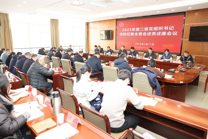 述责述廉汇报分现场汇报和书面汇报两种形式。19位二级党组织书记结合PPT现场汇报了2023年度领导班子成员落实全面从严治党主体责任和党风廉政建设责任制、履行“第一责任人”责任、廉洁自律、存在问题及今后的工作思路等情况。其他二级党组织书记进行书面述责述廉。校纪委委员,二级党组织书记、纪检委员,校纪委相关人员参加会议,并对全体二级党组织书记述责述廉情况进行现场打分。