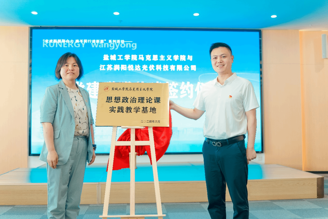 邢晓平与许可为“盐城工学院思想政治理论课实践教学基地”揭牌。共建活动上,江苏润阳新能源科技股份有限公司财务部副经理、党支部书记徐晶与365体育投注社科处处长、马克思主义学院党总支书记、院长包雅玮签订结对共建协议。365体育投注一行参观了润阳新能源三期及展览馆,“沉浸式”感受润阳新能源的发展历程、发展现状、发展前景。