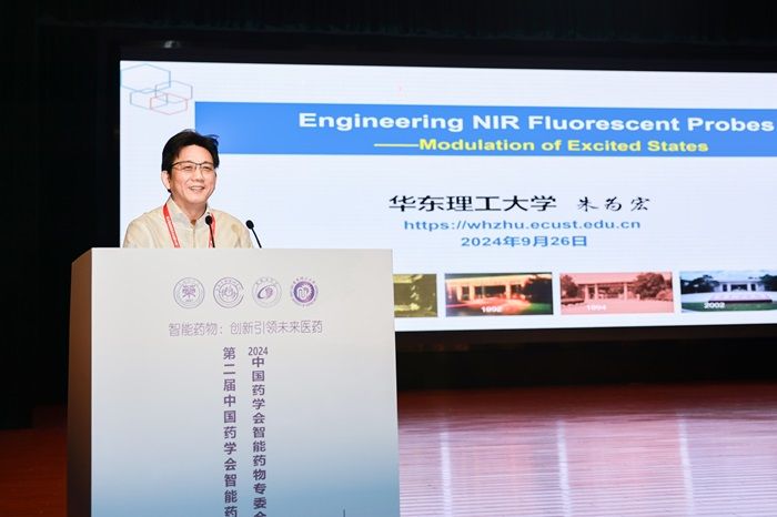 特邀报告环节,张志荣院士作了题为“小分子叔胺导向的脑内高效递药系统研究”的报告;朱为宏院士作了题为“激发态调控:理性设计近红外荧光探针”的报告;江南大学胥传来教授作了题为“面向阿尔兹海默症的手性纳米药物研发”的报告;刘颖斌教授作了题为“胆道肿瘤的临床与基础研究”的报告;郭子建院士作了题为“铂类抗肿瘤药物的智能活化与传送”的报告;北京大学刘志博教授作了题为“放射性药物与放疗相应药物”的报告;四川大学黄园教授作了题为“亚细胞靶向递药系统的研究”的报告;闽江学院贾力院士作了题为“全球智能药物研发现状与未来发展方向”的报告。