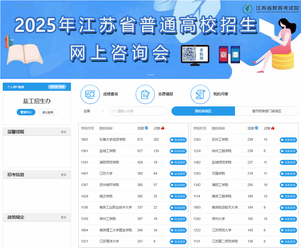 针对省外考生,学校在教育部“阳光高考网”设置盐城工学院招生咨询答疑平台;针对省内考生,参加江苏省教育考试院官网举办的高校招生线上咨询周活动。学校本科生招生网设置了网上咨询模块,积极对全国各地的考生所关心的招生问题进行一一答疑。搭建招生智慧平台,将招生政策、招生计划、往年分数、学院专业等模块进行移动端整合,多维度满足考生信息获取需求,构建更具活力、更具传播力的宣传机制。截止到发稿前,365体育投注在江苏高考网上咨询会人气排名位居前三,而且热度还在持续增长中。