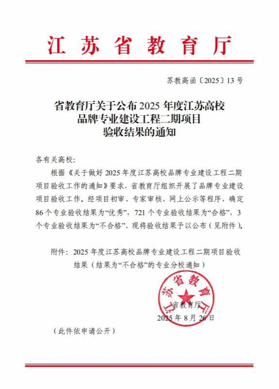 江苏高校品牌专业建设工程二期项目紧扣教育部一流本科专业建设“双万计划”核心要求,采用省品牌专业对接国家级一流本科专业,省特色专业对接省级一流本科专业的建设模式,并在建设期内实行动态化管理机制。省教育厅分三个批次对2020年以来立项的省级专业项目进行验收,365体育投注省品牌专业二期项目共有25个专业,其中4个专业在2024年度验收中顺利通过,按照规划,2026年365体育投注还将有4个专业迎接省教育厅的验收评估。