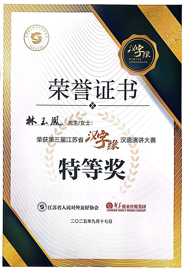 近日,第三届江苏省"汉字缘"汉语演讲大赛在南京落幕,365体育投注人文学院B中文233班泰国留学生林玉凤以《超越山海的乡愁》主题的演讲摘得桂冠,成为全省13市选手中唯一特等奖获得者,即将代表江苏出征全国复赛。