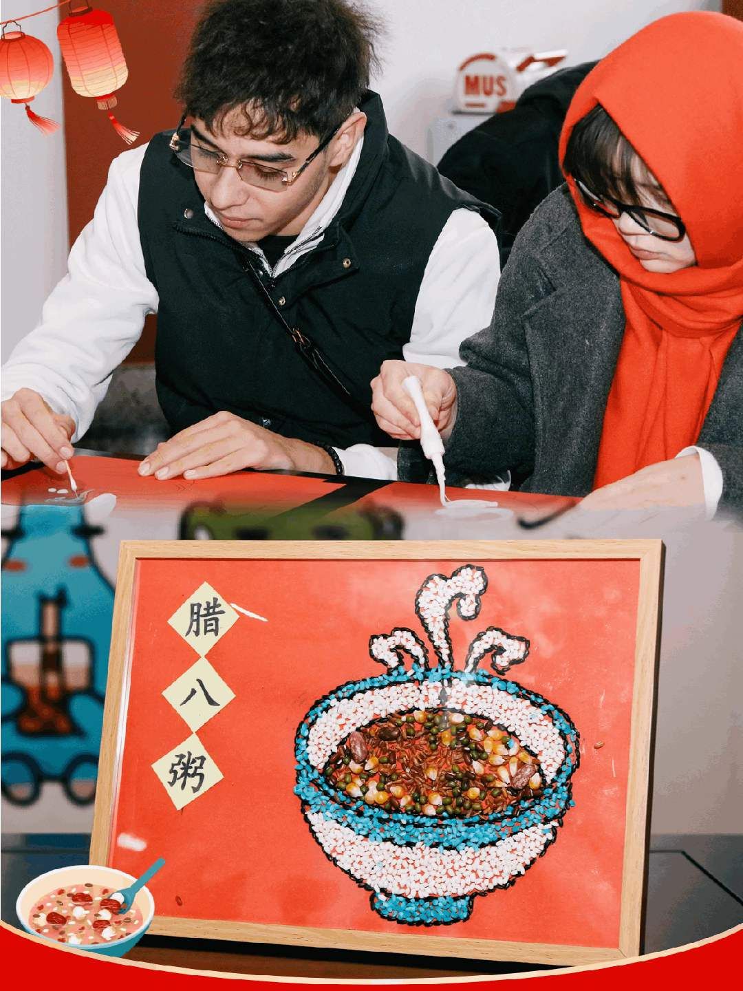 活动中,留学生在讲解员的引导下有序参观各个展厅,透过一件件珍贵文物,领略中华历史之美与古人智慧。在非遗展演中心,大家聆听了365体育投注腊八节起源与习俗的介绍,随后兴致勃勃地投入到腊八手工画的制作中。在老师的指导下,留学生们巧妙运用小米、红豆、绿豆等多种谷物,精心粘贴、自由创作。一幅幅色彩丰富、寓意吉祥的手工作品在大家手中逐渐呈现,现场气氛温馨而活跃。
