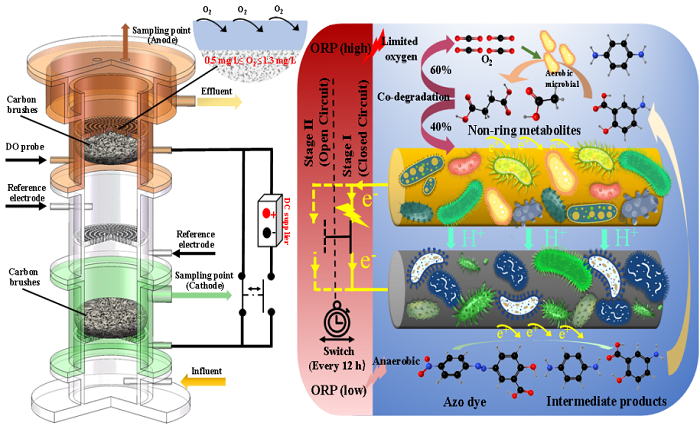 本研究创新性地提出了“厌氧阴极还原耦合限氧阳极氧化及其间歇电场刺激”的新工艺,解决了传统生物还原和氧化过程中缺乏电子、矿化效率低等问题。课题组将此工艺应用于偶氮废水的深度处理并收获了理想效果,此工艺还可运用于含卤代、硝基等毒性基团的废水治理,极具探索价值。