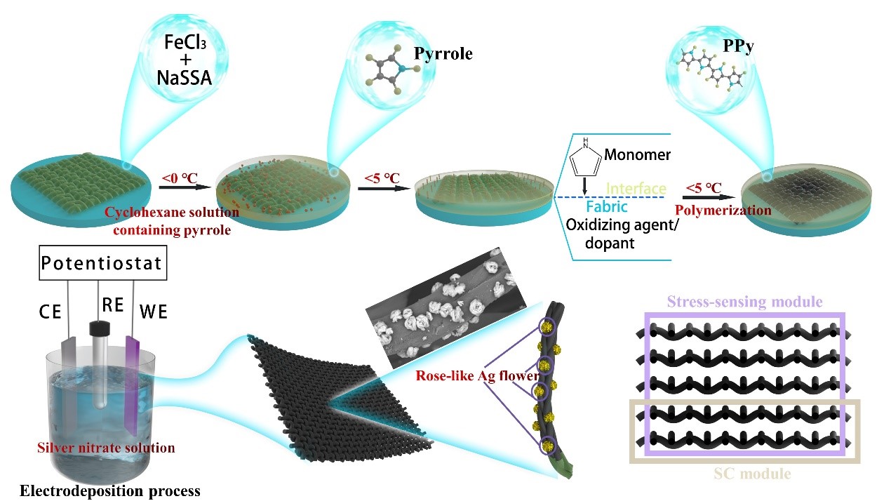 2022年,365体育投注纺服学院教师吕景春博士(第一作者)与苏州纳米技术与纳米仿生研究所张少辉博士(通讯作者)合作,在化工领域顶级学术期刊《Chemical Engineering Journal》(TOP,IF=16.744)上发表题为“Multifunctional polypyrrole and rose-like silver flower-decorated E-textile with outstanding pressure/strain sensing and energy storage performance”的研究论文。