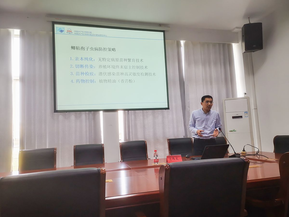 习丙文研究员以“鲫鱼孢子虫病防控研究进展”为题,分享了团队近年来在鲫鱼洪湖孢子虫的分类、传播途径、传染源、侵染与发育过程等方面的研究成果,为鲫鱼孢子虫病的防控提供了新思路。