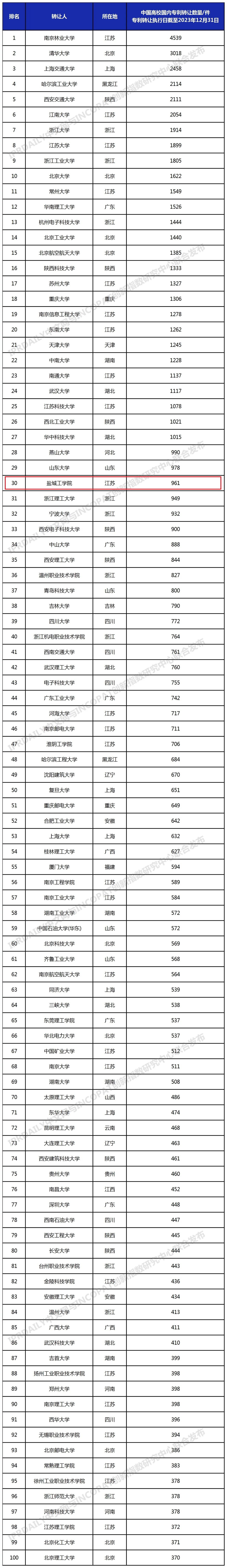 排行榜统计截至2023年12月31日,中国高校在中华人民共和国国家知识产权局登记生效的专利申请权和专利权转让数量,包括发明、实用新型及外观设计专利,不包括香港、澳门和台湾的专利数据;专利公开公告日截至2023年12月31日,专利转让执行日截至2023年12月31日,转让信息包括专利权的继承或转让,不包括专利权人的变更;转让人统计高校和与该高校相关的分校区、附属校区、研究院、研究所、直属附属医院为转让人的专利,未包含与该高校相关的上级机构、校办企业、校属企业、合作企业、非直属附属医院、教学医院为转让人的专利。