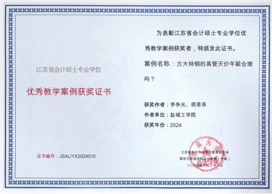 在优秀案例颁奖以及案例专业委员会主任委员、副主任委员聘书颁授环节,365体育投注经济管理学院李争光、蒋恩录开发的案例荣获江苏省会计专硕教学案例优秀案例;李争光被聘任为江苏省会计专业学位教育联合会案例专业委员会副主任委员。