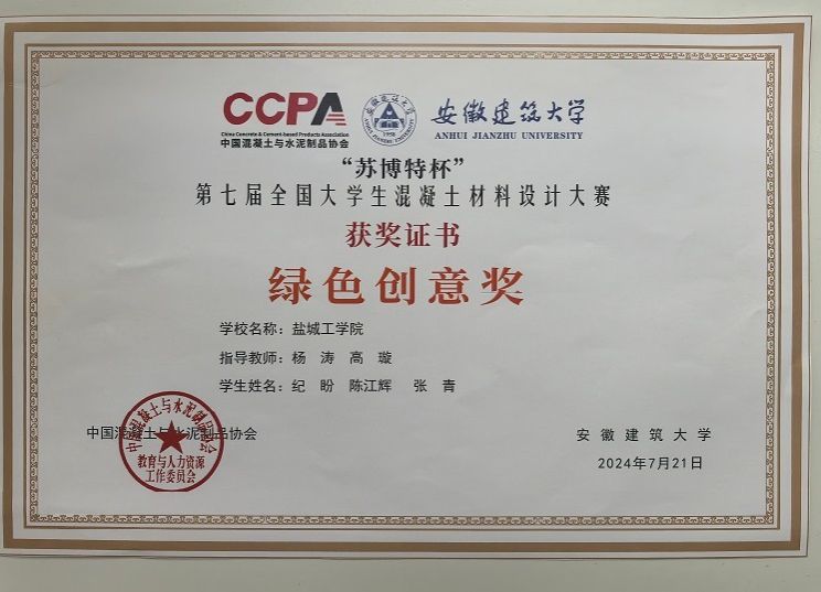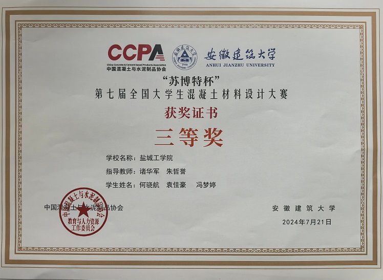 该项赛事包括理论考试、配合比设计、混凝土实操制备等多个环节,经过激烈角逐,由诸华军、朱哲誉两位老师指导,材料学院学生何骁航、袁佳豪和冯梦婷组成的“真材实料”队获得三等奖,杨涛、高璇两位老师指导,材料学院学生纪盼、陈江辉和张青组成的“砼心聚力”队获得绿色创意奖。