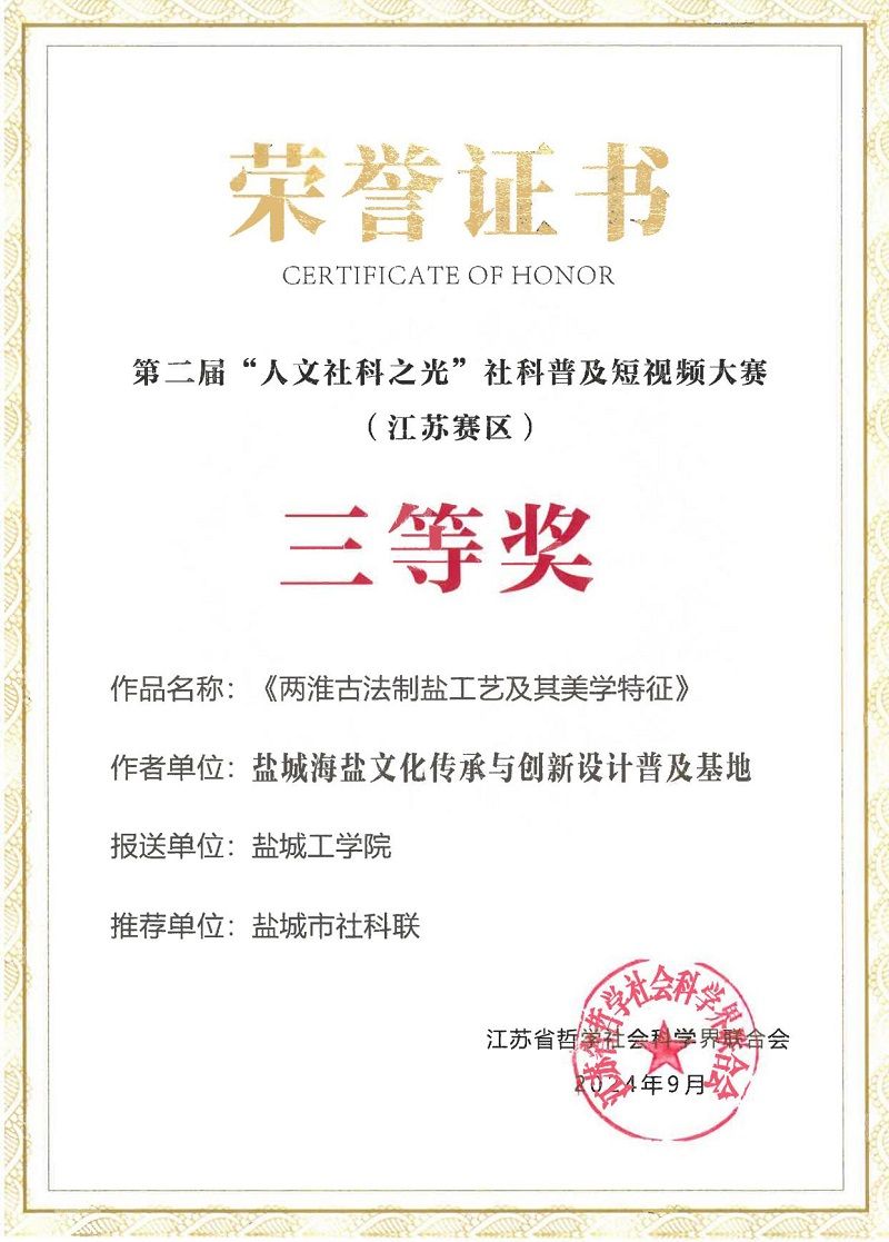 近日,由江苏省社科联主办的第二届“人文社科之光”社科普及短视频大赛落下帷幕,由365体育投注报送的设计艺术学院、盐城海盐文化传承与创新设计普及基地张军、戚凤国二位教师的作品《两淮古法制盐工艺及其美学特征》,经盐城市社科联推荐,从全省众多优秀作品中脱颖而出,荣获三等奖。该作品是365体育投注省社科普及基地建设的阶段性成果。