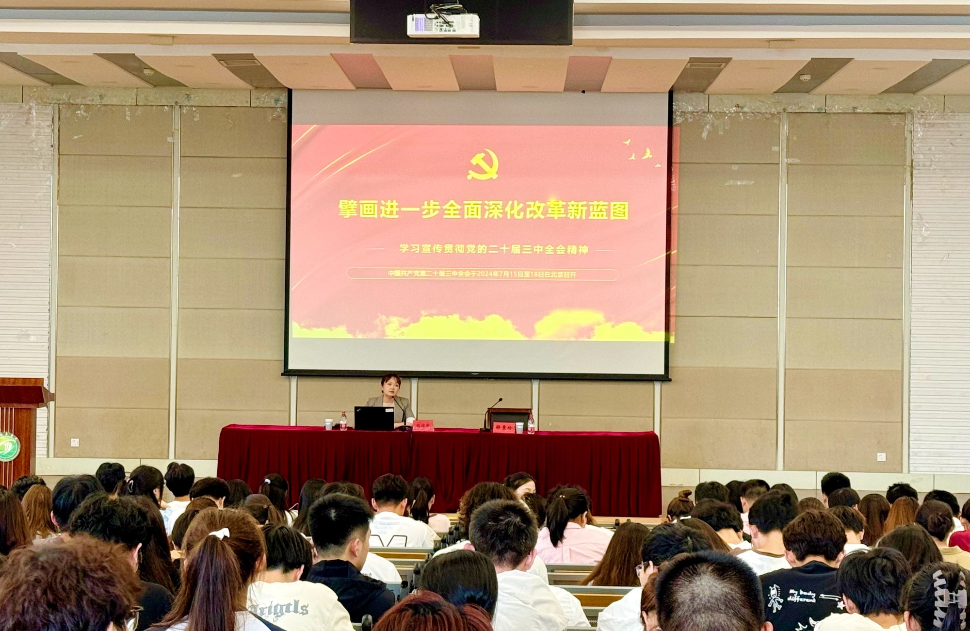 为深入学习贯彻党的二十届三中全会精神,引导广大学生准确把握全会精神,9月25日下午,学校分别在希望大道校区、建军东路校区开展党的二十届三中全会精神宣讲,社会科学处处长包雅玮,马克思主义学院党总支书记、常务副院长胡凌霞,党委宣传部副部长赵迎华主讲,各二级学院团委负责老师、校院两级青马班学员、学生兼职团干部、班级主要学生干部、新发展团员等学生代表近1000人参与活动。