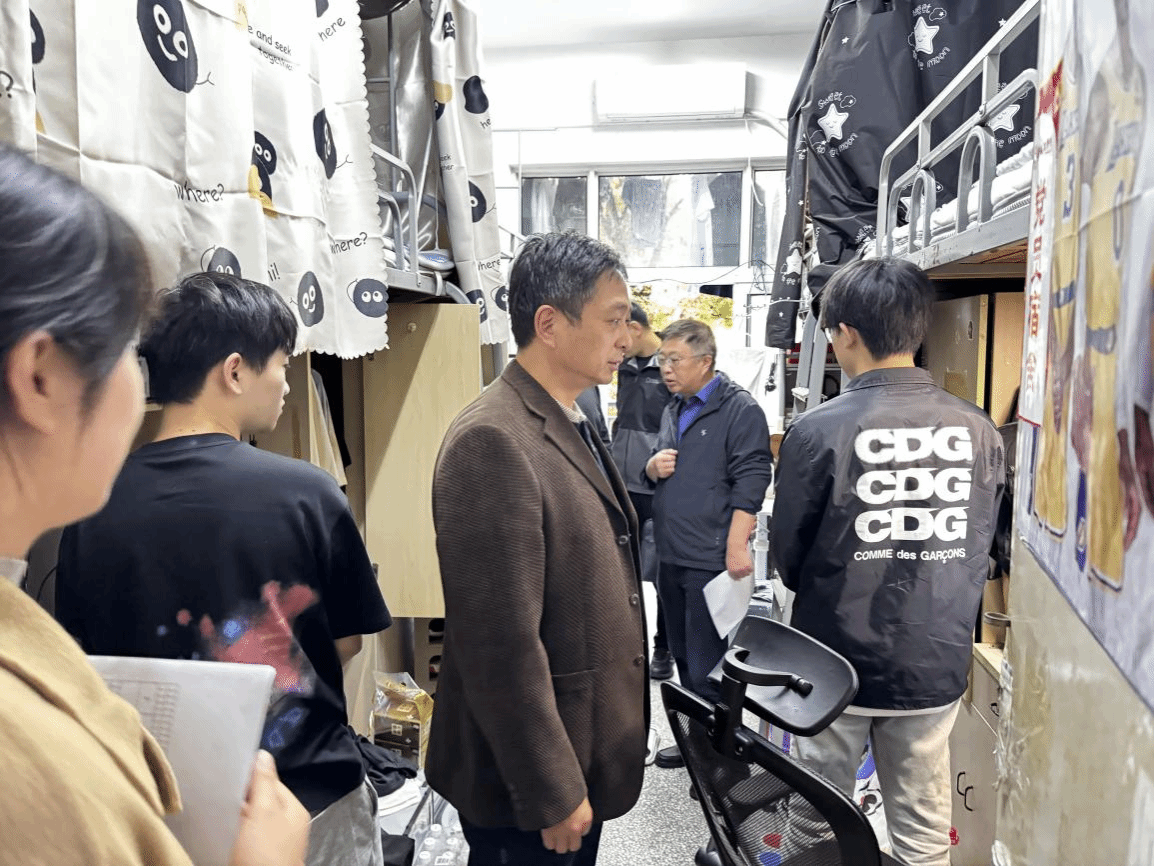 走访宿舍过程中,学院领导老师们与同学们进行亲切交流,陈阳详细了解了学生宿舍生活状态,指导大家如何整理宿舍内务以及公共区域的卫生,要求同学们养成良好的生活习惯,保持健康的身体状态。周旺基特别叮嘱同学们注意宿舍用电安全,坚决不用大功率违规电器,离开宿舍务必断电、拔掉手机充电线等,共同营造一个安全有序的寝室生活环境。